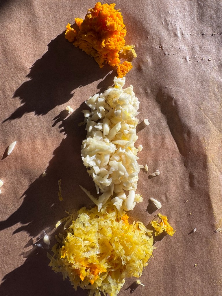 1. Do your prep work for the sauce so that you don’t have to rush with it later on. I minced 5 garlic cloves, minced about 1.5 Tbs of ginger, and zested half a lemon. Set this aside and now you can begin cooking