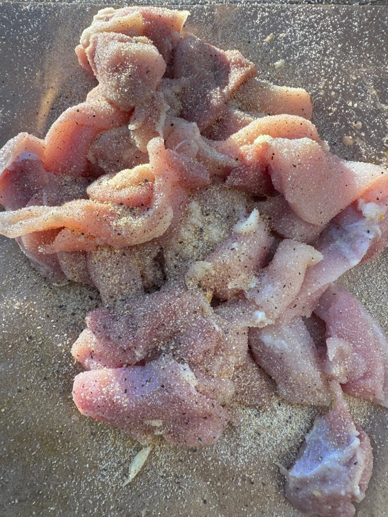 2. Now you want to trim the chicken you will be using. If you decide to use tenders, ensure you take out the tendon. Cut your chicken into bite size pieces. Once all your chicken is cut up season your chicken with salt, pepper, onion powder, and garlic powder.