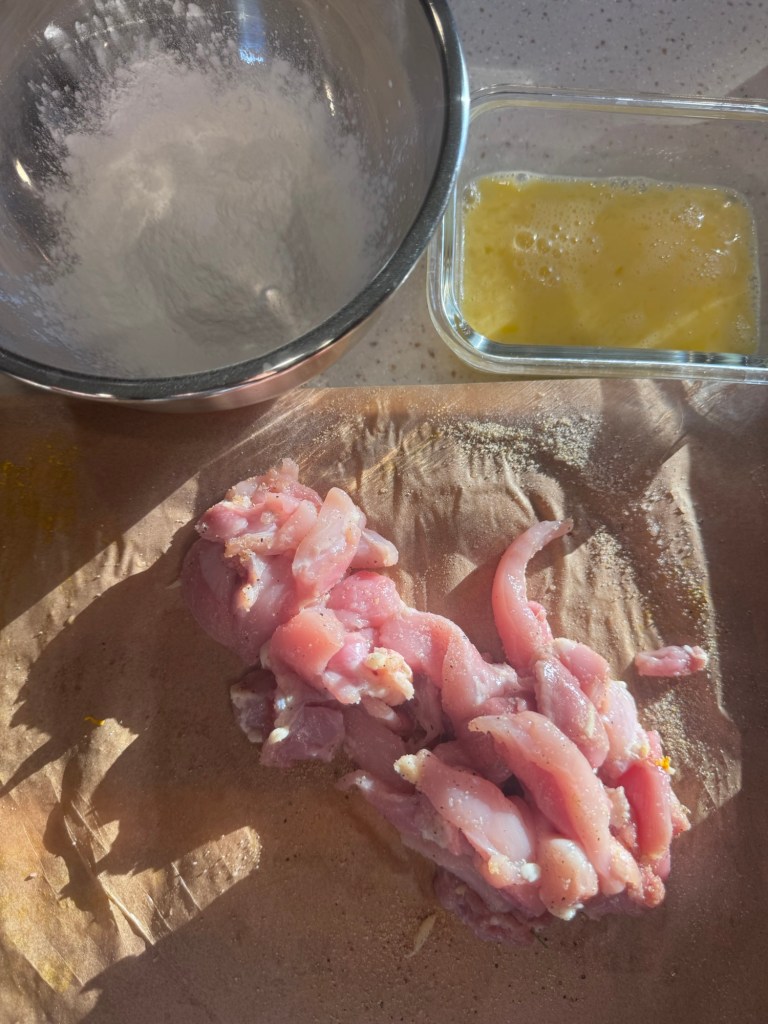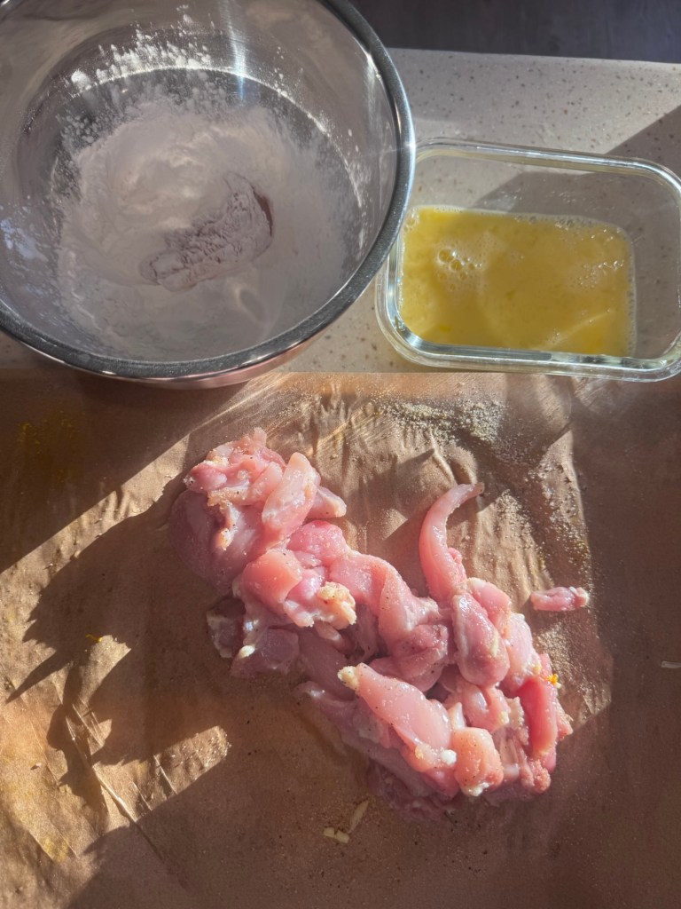4. Next you will coat your chicken in the beaten egg and then the arrowroot starch, see picture for example. Do this with all your chicken, and then we will move onto cooking!